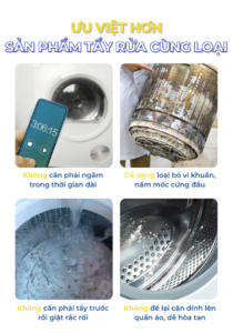– Diệt 99% vi khuẩn, nấm mốc bám trong máy, quần áo.