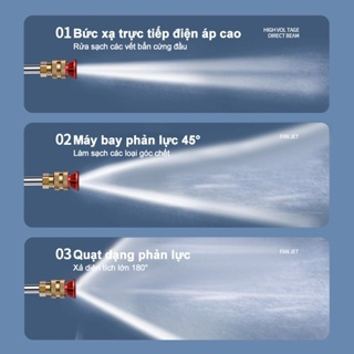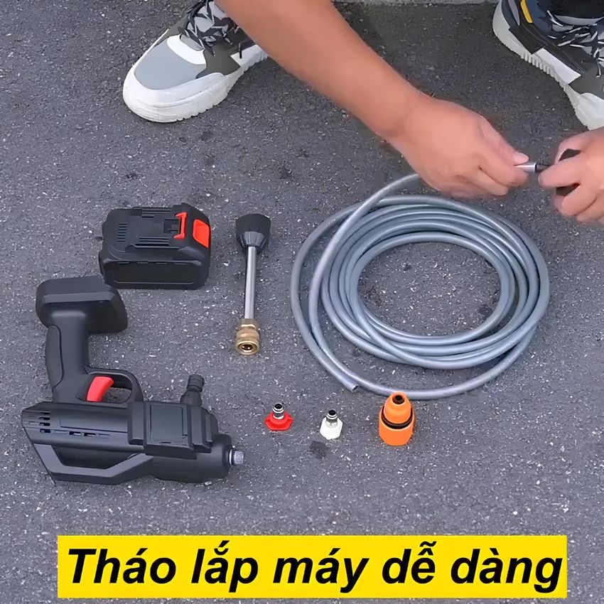 Máy rửa xe bằng pin cầm tay bao gồm cuộn dây 5m, đầu phun, bình xịt và các chi tiết khác.