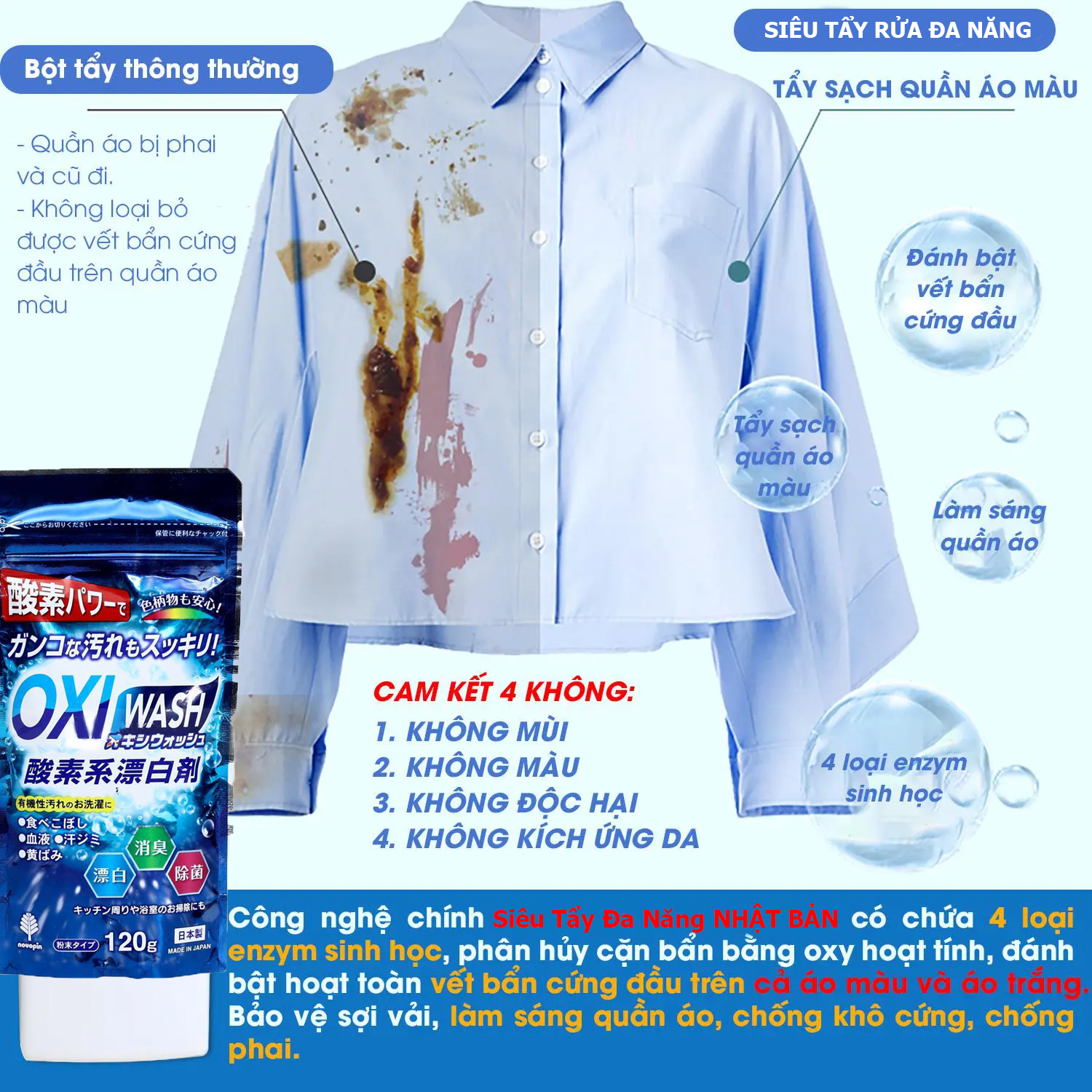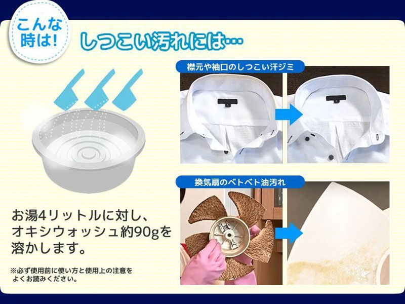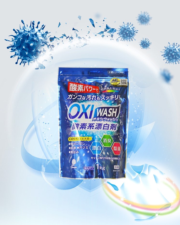 – Công dụng: là chất tẩy rửa đa năng siêu mạnh giúp đánh tan các vết bẩn cứng đầu như vết ố vàng quần áo, dầu mỡ lâu ngày, cặn canxi trên gương kính hay thiết bị vệ sinh, tẩy rửa và làm bóng đồ dùng nhà bếp bằng inox. Chất tẩy rửa OXI Wash siêu mạnh có thể làm sạch và làm sáng nhiều bề mặt khác nhau như vải , inox, sứ, thủy tinh, gạch men v.v.
